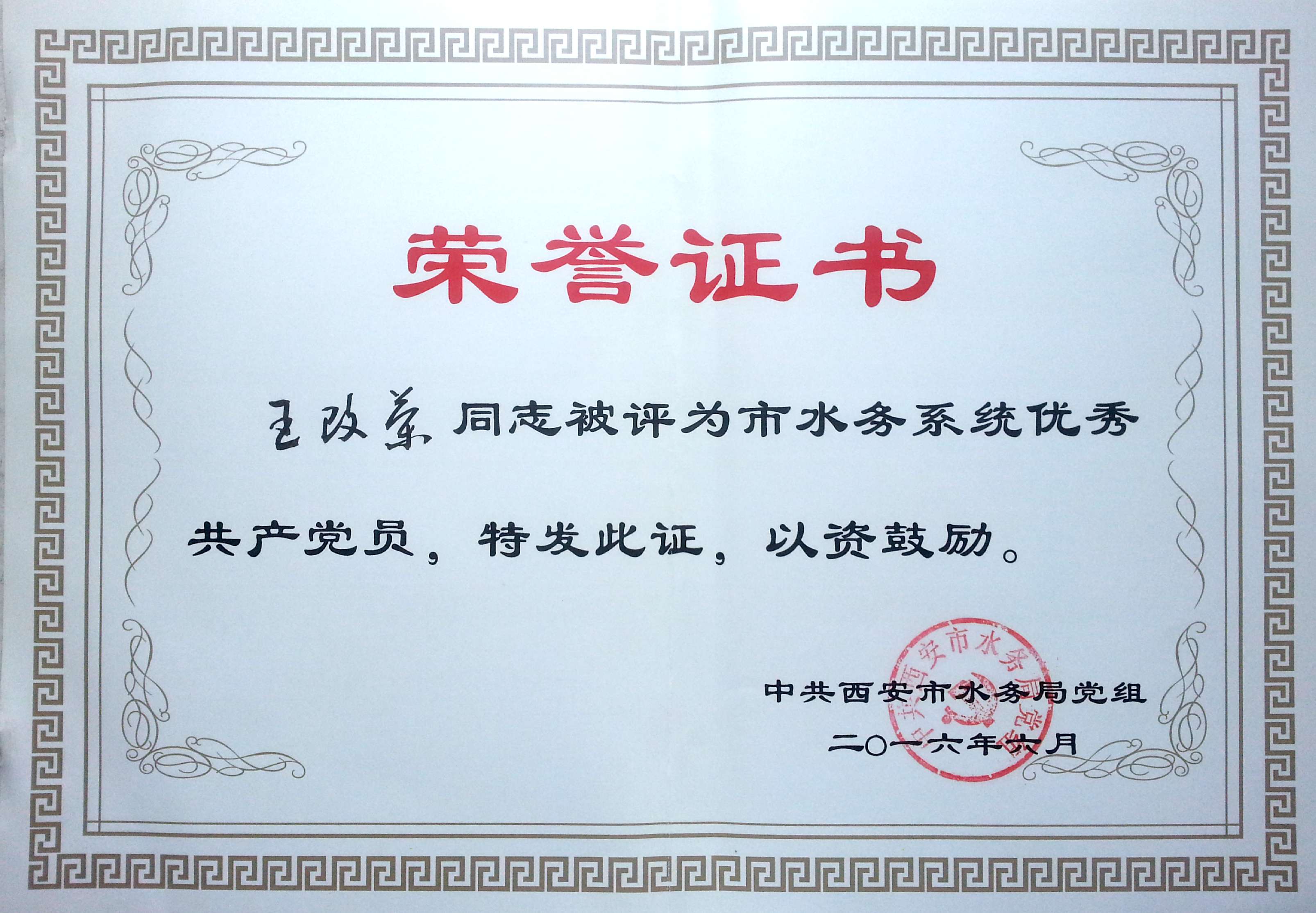 我單位王改榮同志,在2016年6月6日被中共西安市水務局黨組評為市水務系統優秀共產黨員。