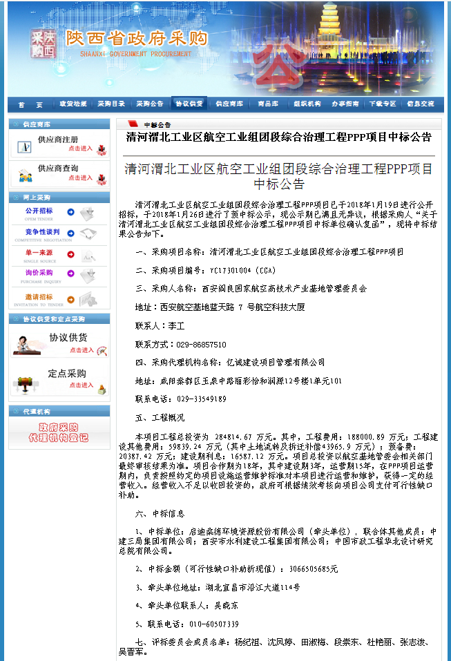 清河渭北工業區航空工業組團段綜合治理PPP項目于2018119日進行公開招標,經評標委員會評審,推薦以啟迪桑德環境資源股份有限公司牽頭,與中建三局集團有限公司、西安市水利建設工程集團有限公司中國市政工程華北設計研究總院有限公司組成的聯合體中標。